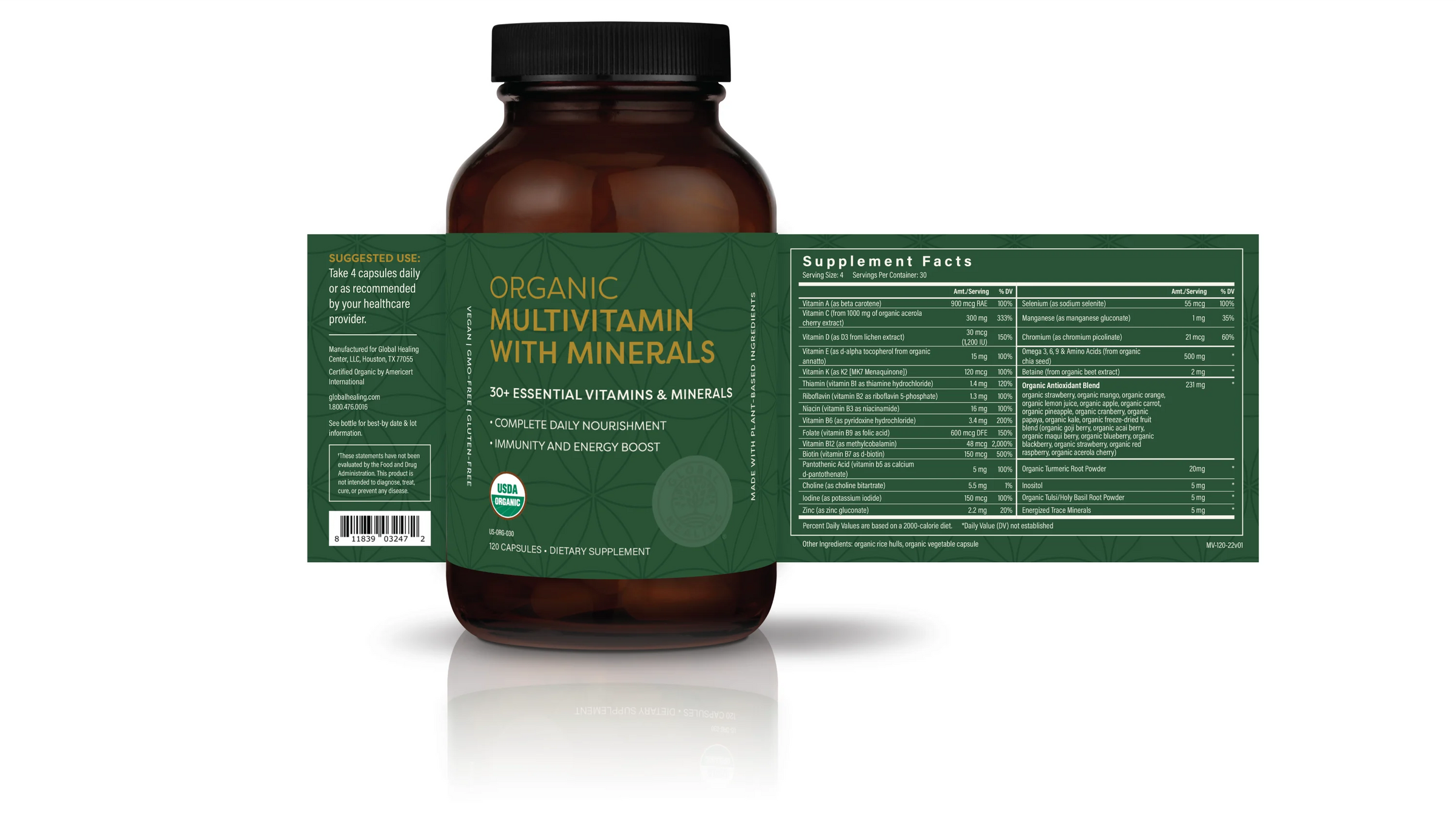Do you struggle to get all the vitamins and minerals your body needs from your diet alone? Don't worry, you're not alone! That's why Global Healing has created their organic multivitamin with over 30 essential nutrients and an antioxidant boost to help fill in any gaps.